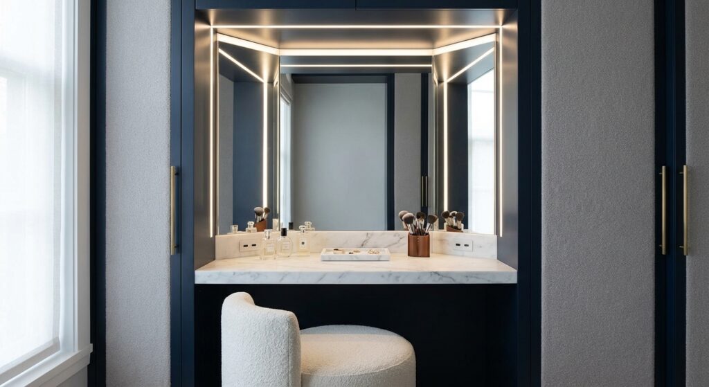 A properly designed integrated vanity nook includes a mirror lit from three sides (not top-only, which creates unflattering shadows), a surface depth of at least 20 inches to accommodate professional-grade tools, and dedicated power with USB-C outlets recessed into the counter edge. The mirror itself — increasingly specified as a smart mirror with adjustable color temperature between 2700K (candlelight) and 6500K (daylight) — allows accurate application in both indoor and outdoor lighting simulations.