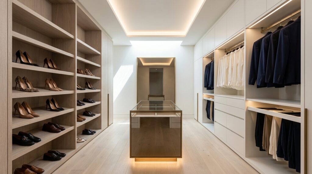 Lighting in a boutique-model closet operates in layers, following the same logic used by luxury retail architects. The three layers are ambient (overall room fill), task (specific work surfaces and mirrors), and accent (display illumination for shelves, islands, and back panels). Each layer is independently controlled, typically via a scene-based dimmer system that allows preset “morning,” “evening,” and “display” modes.